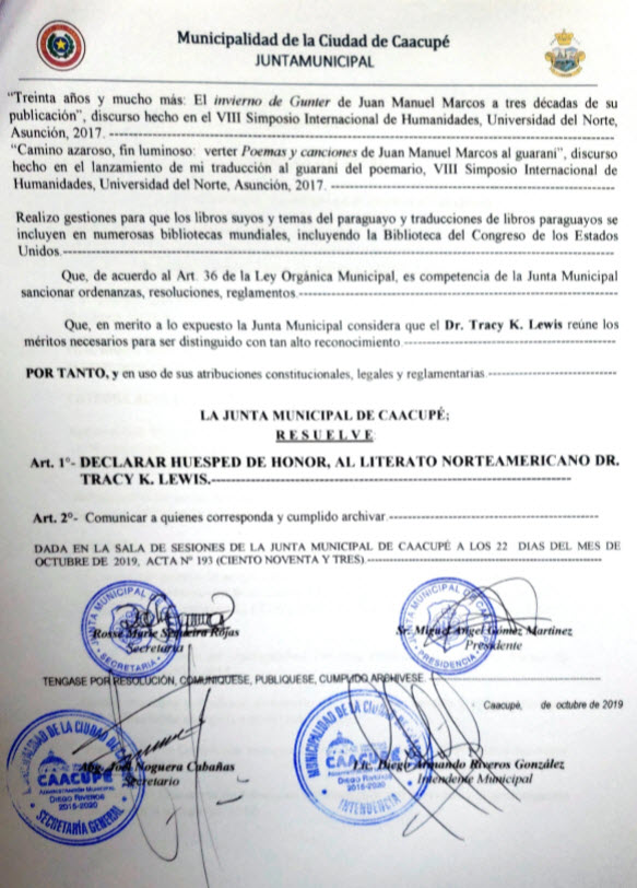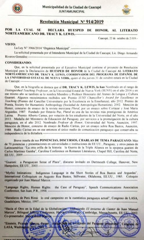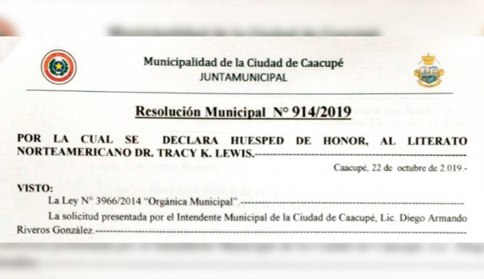 La Municipalidad declara huésped de honor, al literato norteamericano Dr. Tracy K. Lewis, coordinador del programa de español de la Universidad Estatal de Nueva York, quien el día jueves 31 de octubre estará en la ciudad de Caacupé.