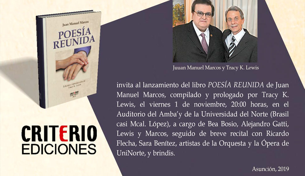 Lanzamiento del libro POESÍA REUNIDA de Juan Manuel Marcos Fecha 1 de noviembre de 2019 Viernes 1 de noviembre a las 20:00 hs. en el Auditorio del Amba’y de la Universidad del Norte (Brasil c/ Mariscal López). Compartir: uniadmin Publicación anterior Reconocimiento de la Municipalidad de Caacupé al Dr. Tracy K. Lewis 1 de noviembre de 2019 Siguiente publicación Alumnos de la Universidad del Norte participaron del Inter Universitario de Villa Hayes 5 de noviembre de 2019 También te puede interesar Actividades de extensión e investigación en la catedra de Pediatría 7 septiembre, 2024 Jornada llevada a cabo en la Clínica de la Fundación Operación Sonrisa Paraguay 1 septiembre, 2023 Culminación de Proyecto Interdisciplinar 1 septiembre, 2023